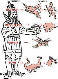 First of all we saw the description of Nebuchadnezzar's image in Daniel 2 showing the four human world empires that would arise in the course of history. Daniel 7 predicted the four empires once again, giving us more detail, especially of the Roman Empire (dragon).
